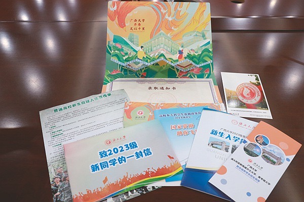 廣西大學(xué)教務(wù)處副處長彭林欣介紹,隨本科生錄取通知書一同寄出的,除了明信片,還有2023年新生入學(xué)須知、廣西大學(xué)生資助政策簡介、普通高校新生應(yīng)征入伍宣傳單、致2023級(jí)新同學(xué)的一封信、新生行李標(biāo)簽等材料。