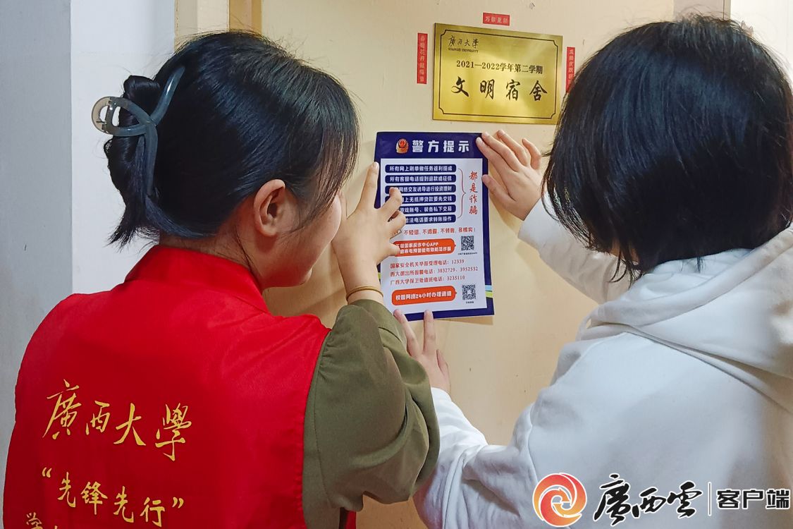“未知鏈接不點擊,陌生來電不輕信,個人信息不透露,轉賬匯款多核實!”來自文學院的曾薈楠同學在學生社區開展反詐宣傳志愿服務時說道。近日,學生黨員走進西22棟宿舍,向同學們講解高校發生的詐騙案例,并重點介紹了兼職刷單類、校園貸款類、冒充客服類等常見詐騙類型,提醒大家加強對人身、財產安全的保護。