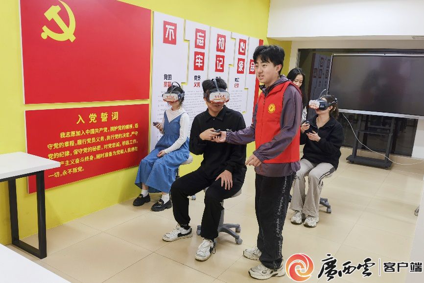 “現在可以選擇中共一大紀念館、遵義會議紀念館、東北抗聯史實陳列館參觀······”來自動物科學技術學院的曾觀麗同學正在“一站式”學生社區的黨員活動室開展黨史宣講志愿服務,為VR智慧黨建系統體驗者提供學習內容介紹。戴上VR眼鏡,手持感應手柄,即可通過數字虛擬現實技術,身臨其境般地參觀展覽館。