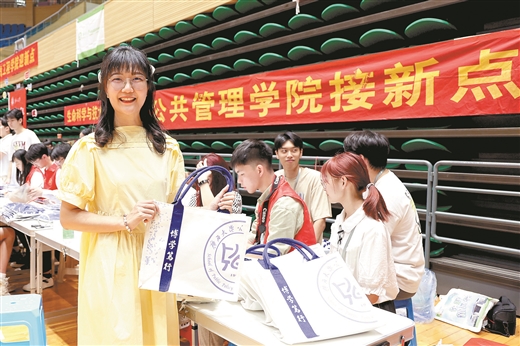 為了迎接新生,各學院都準備了新生禮包。在新聞與傳播學院的新生禮包中,除了實用的校園安全手冊,還有精美的文創手提袋、西大校徽、校園卡卡套,連學院專屬院服都安排上了。公共管理學院更是貼心,送出的禮包里有扇子,以及學長學姐親手設計的筆記本,封面不僅有中文的“公共管理學院”字樣,還融入了壯文元素,創意十足。