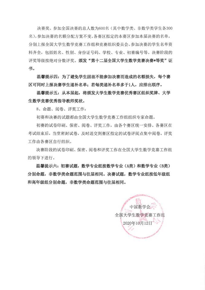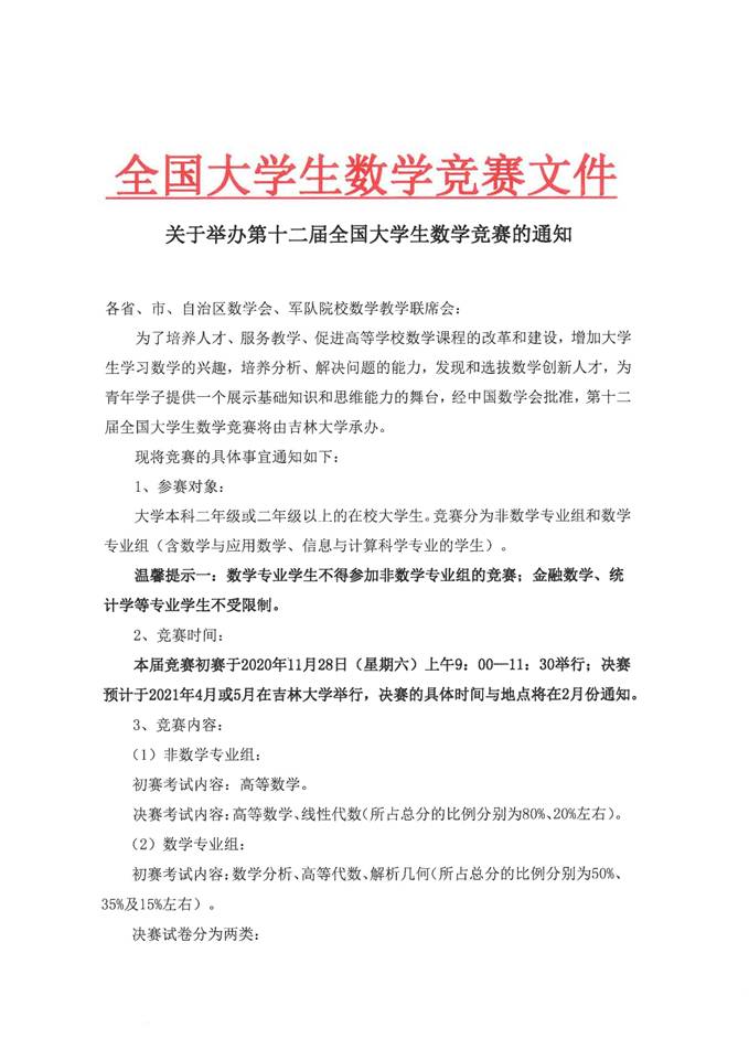 為了促進高等學校數學課程的改革和建設,激發廣大學生學習數學的興趣,培養他們分析問題和解決問題的能力,發現和選拔數學創新人才,為青年學子提供一個展示自我的舞臺。中國數學會將于2020年11月28日舉辦第十二屆全國高校大學生數學競賽。參加這項活動,有助于全面展示我校高等數學教學水平和教學改革的成果,有助于學生夯實和擴展高等數學知識與基本技能,對考研學生復習高等數學和全面提高大學生數學綜合運用能力起促進作用。我校在第一屆至第十屆全國大學生數學競賽中均取得了優異的成績。請各學院大力宣傳,鼓勵學生積極參賽。